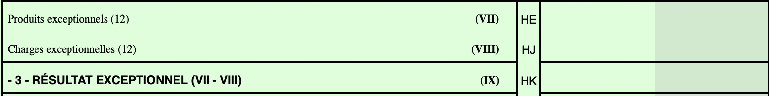 L’utilisation du tableau “Résultat exceptionnel” est maintenant très restreinte. En conséquence la DGFiP n’a pas jugé utile de conserver, dans la nouvelle présentation, le détail des charges et produits exceptionnels en deux fois quatre lignes (HA, HB, HC, HD et HF, HG, HH, HI) comme c’était le cas précédemment.