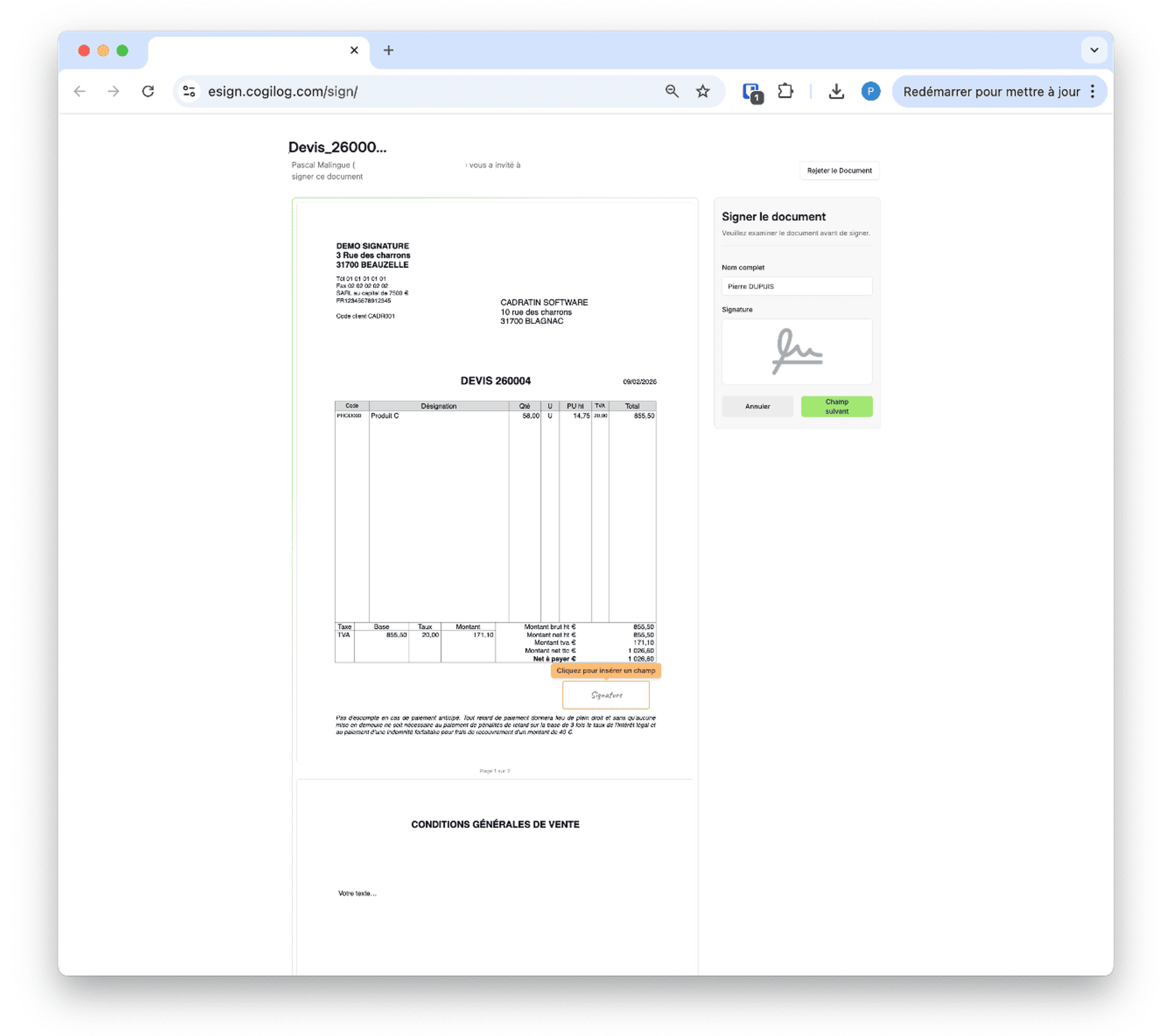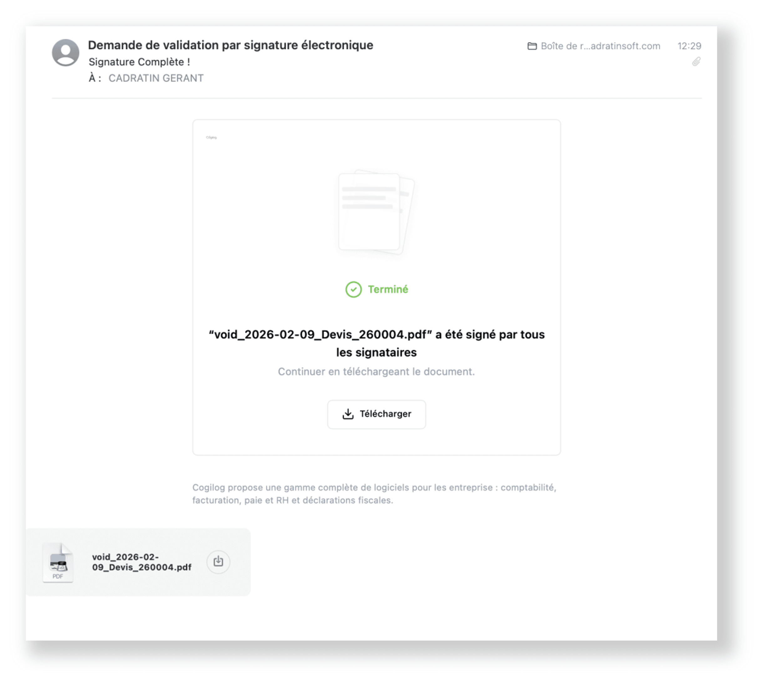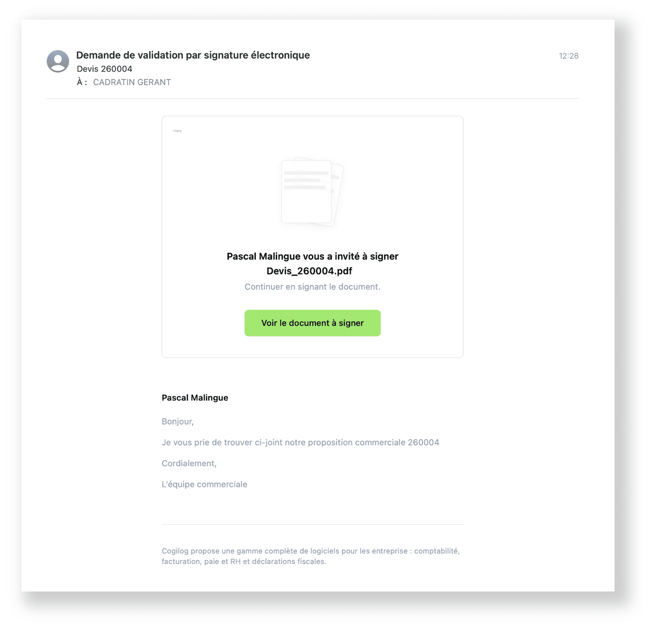 Cogilog vous permet désormais d'envoyer à vos clients une demande de signature d'un document (devis bon de commande...).
