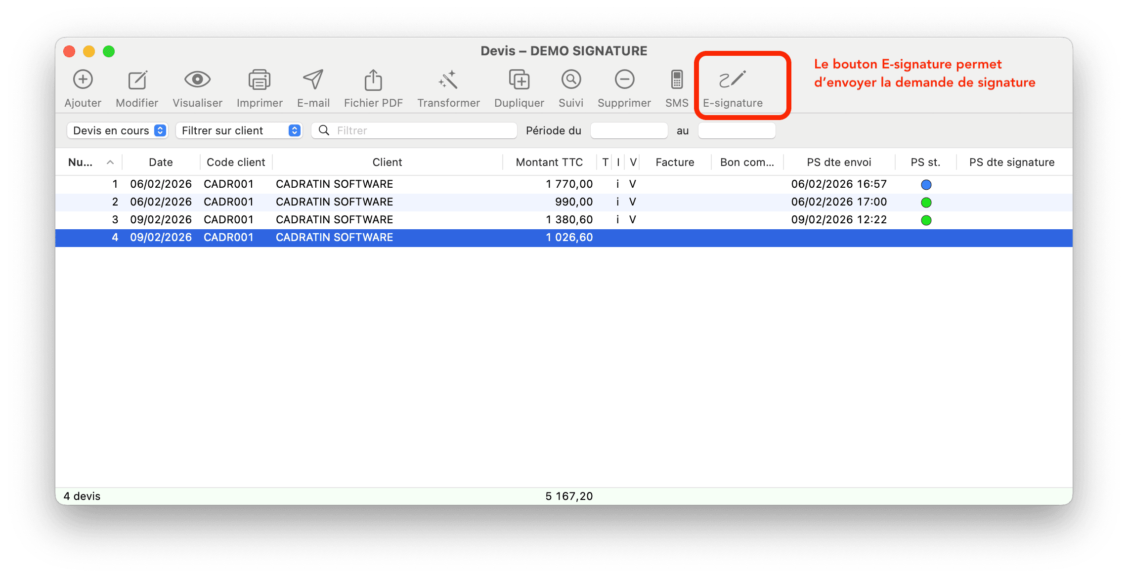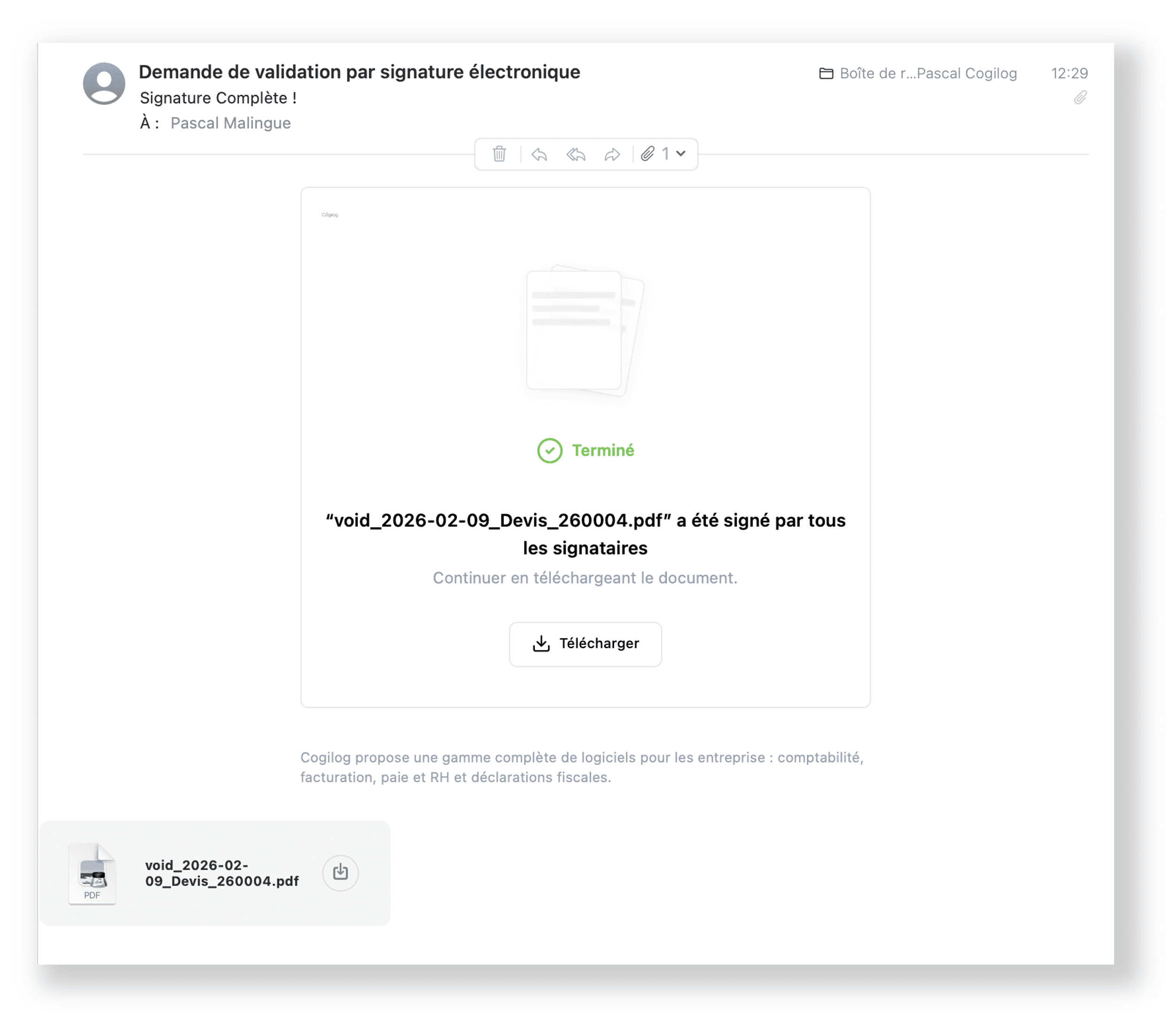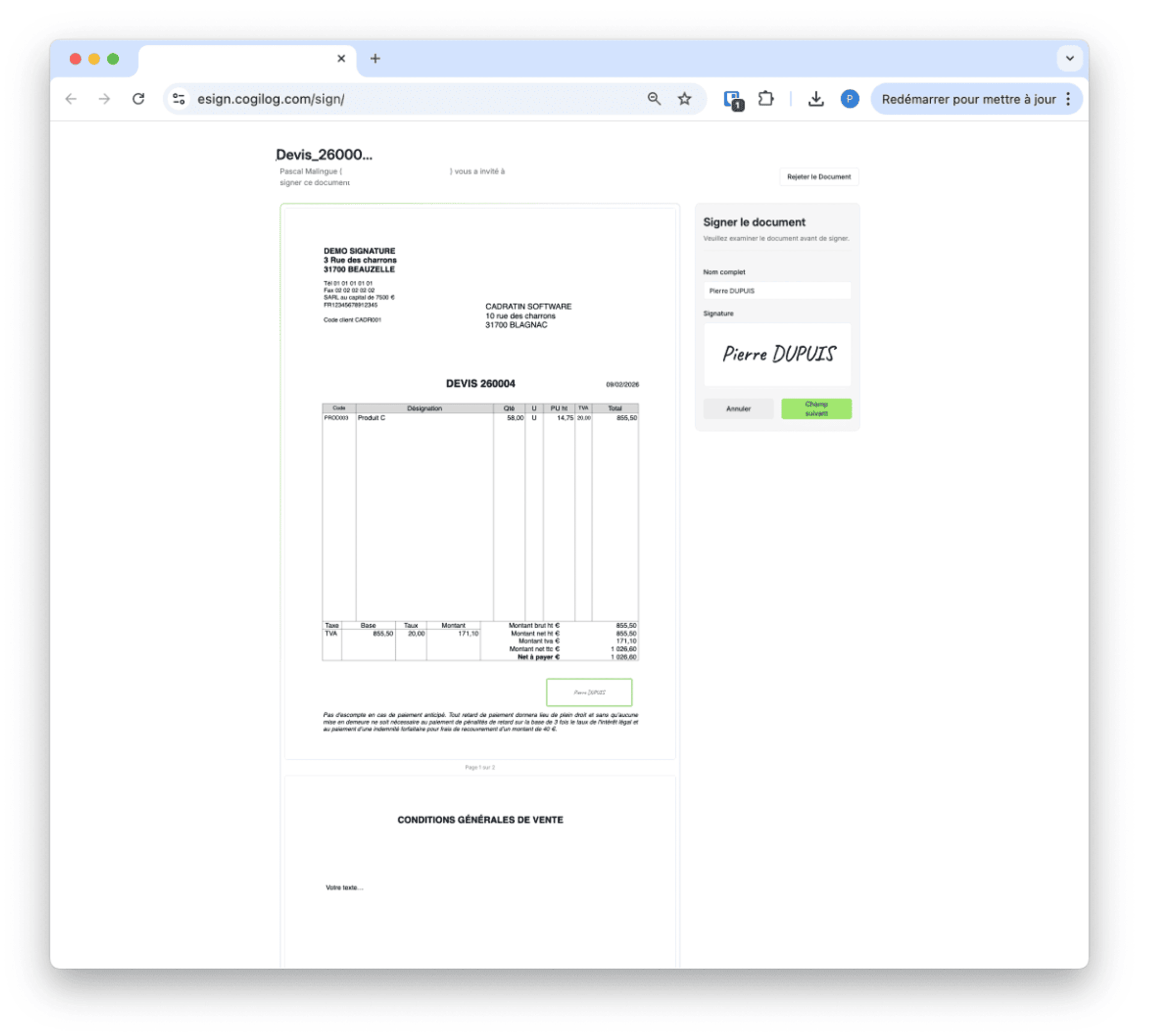 Cogilog vous permet désormais d'envoyer à vos clients une demande de signature d'un document (devis bon de commande...).